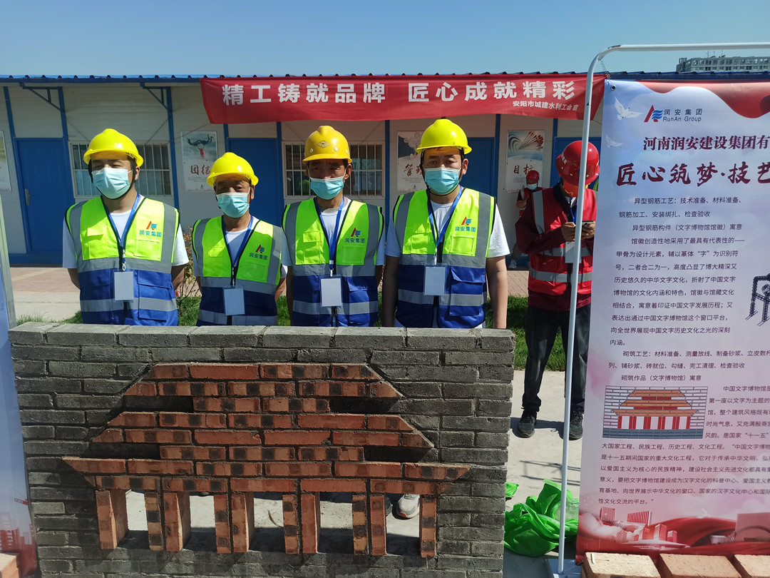 本次技能展示活動設(shè)置了鋼筋綁扎和砌筑兩個項目,我公司派遣八名職工代表參加了本次技能展示,選手們身著統(tǒng)一工作服,以嫻熟的操作技能展現(xiàn)了過硬的技術(shù)水平。砌筑工速度與質(zhì)量并重,一手拿著泥刀,一手不停地一塊塊砌磚,每一道工序、每一個細節(jié)都力求做到完美,最終圓滿完成了砌筑作品《文字博物館》。鋼筋工粗中有細,在大面積作業(yè)的同時,即時進行細節(jié)處理,確保作品垂直、平整,經(jīng)過一系列的復雜操作,一個完美的安陽文字博物館館徽便呈現(xiàn)在眼前。高超的技藝水平贏得了領(lǐng)導和現(xiàn)場觀眾的一致稱贊。
