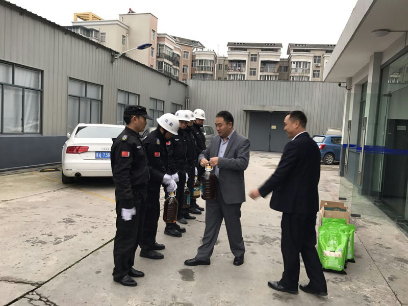 (陟翔集團(tuán)股東代表王訓(xùn)江和保安大隊長袁貴軍為各點保安員送上慰問品)